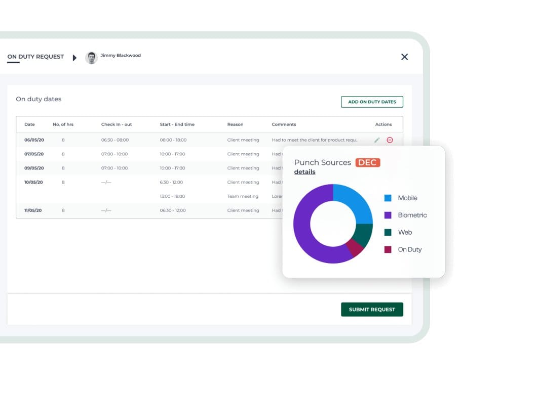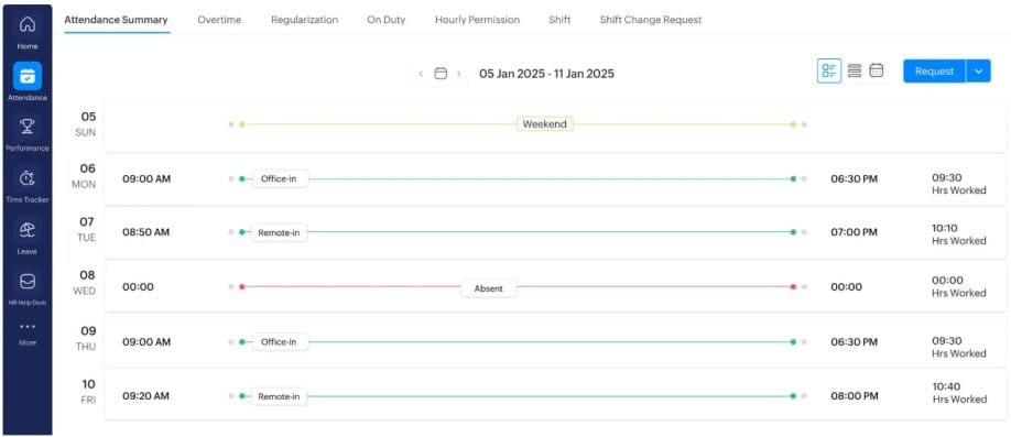 - Allows employees to raise requests to regularise missed punches or correct attendance records (e.g., if they forgot to check in)