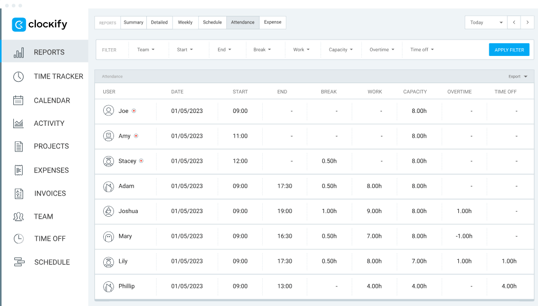Clockify is an attendance tracking software that allows employees to clock in and out of work, and it gives managers a clear view of who is working, when, and for how long. It provides a calendar-like view of the entire team's hours for the week, making it easy to spot attendance patterns and discrepancies. Managers can create and assign shifts, making it a more traditional scheduling and attendance system. In addition, it enables managers to set up categories for vacation, sick leave, personal day, public holiday, maternity/paternity leave, etc.