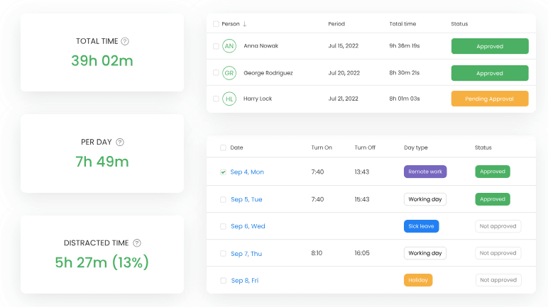 - Managers get a live view of who is currently working, who is late, and who is absent