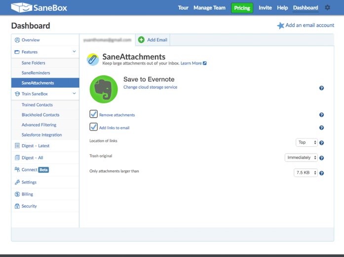 - Allows automatic upload of all email attachments to Dropbox, Box, Evernote, or Google Drive