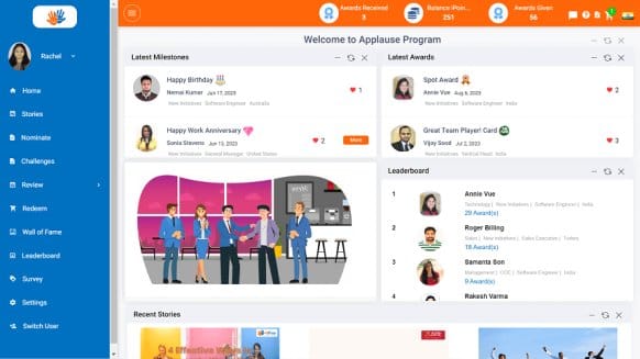 Workhuman is an employee recognition software that enables employees and managers to publicly recognize contributions in a social feed. Employees can earn redeemable points, including Gift cards, merchandise, and custom rewards. Employees can align recognition with company values, including #Teamwork and #Innovation. An HR can collect frequent surveys to gauge morale and get alerts on recognition gaps or engagement drops. In addition, it allows organizations to set different reward levels (e.g., small wins vs. major achievements).