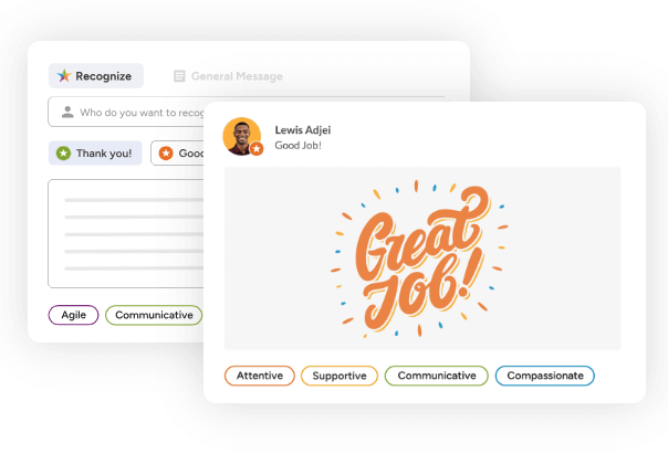 - Managers can publicly or privately acknowledge employees with personalized messages and rewards