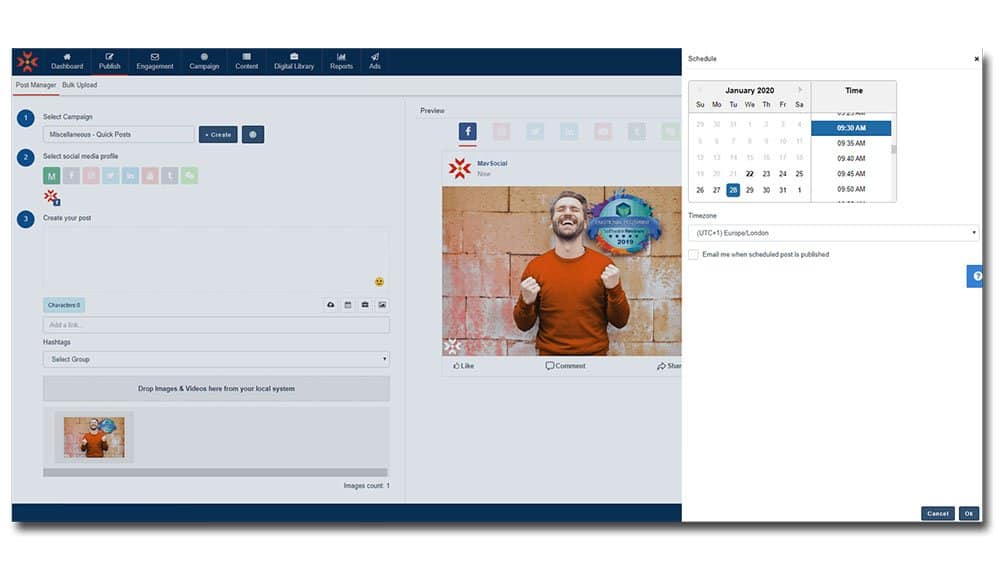 MavSocial is a cloud-based social networking software suitable for businesses of all sizes. Allows users to publish posts on multiple social media websites, such as Linkedin, Twitter, YouTube, Instagram, Facebook, etc. Enables users to review posts before publishing. Allows team members to collaborate and edit posts or content. MavSocial networking software enables users to track competitors’ social media performance. Also provides a free trial.